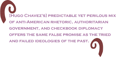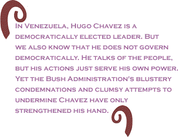 And we know that freedom across our hemisphere must go beyond elections. In Venezuela, Hugo Chavez is a democratically elected leader. But we also know that he does not govern democratically. He talks of the people, but his actions just serve his own power. Yet the Bush Administration's blustery condemnations and clumsy attempts to undermine Chavez have only strengthened his hand.