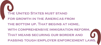 That is why the United States must stand for growth in the Americas from the bottom up. That begins at home, with comprehensive immigration reform. That means securing our border and passing tough employer enforcement laws. It means bringing 12 million unauthorized immigrants out of the shadows. But it also means working with Mexico, Central America and others to support bottom up development to our south.