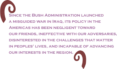 Since the Bush Administration launched a misguided war in Iraq, its policy in the Americas has been negligent toward our friends, ineffective with our adversaries, disinterested in the challenges that matter in peoples' lives, and incapable of advancing our interests in the region.