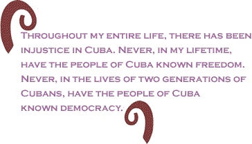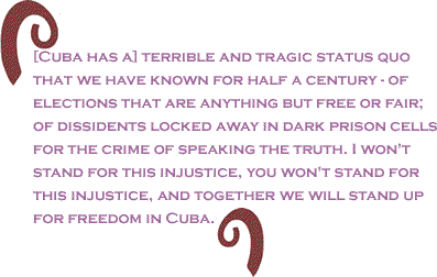 Throughout my entire life, there has been injustice in Cuba. Never, in my lifetime, have the people of Cuba known freedom. Never, in the lives of two generations of Cubans, have the people of Cuba known democracy. This is the terrible and tragic status quo that we have known for half a century - of elections that are anything but free or fair; of dissidents locked away in dark prison cells for the crime of speaking the truth. I won't stand for this injustice, you won't stand for this injustice, and together we will stand up for freedom in Cuba.
