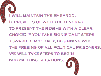 I will maintain the embargo. It provides us with the leverage to present the regime with a clear choice: if you take significant steps toward democracy, beginning with the freeing of all political prisoners, we will take steps to begin normalizing relations. That's the way to bring about real change in Cuba - through strong, smart and principled diplomacy.