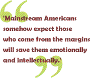 "The black character helps the white character, which demonstrates that [the former] feels this incredible interest in maintaining the existing society. Since there is no cultural interchange, the character is put there to give the illusion that there is cultural crossover to satisfy that need without actually addressing the issue," Dorfman says. "As a Chilean, however, I sense that maybe deep inside, mainstream Americans somehow expect those who come from the margins will save them emotionally and intellectually."