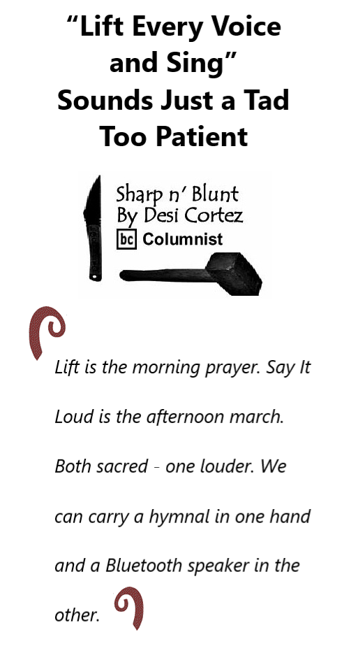 psychological, cultural, ancestral. Lift Every Voice and Sing is the trembling heartbeat of hope, wrapped in linen